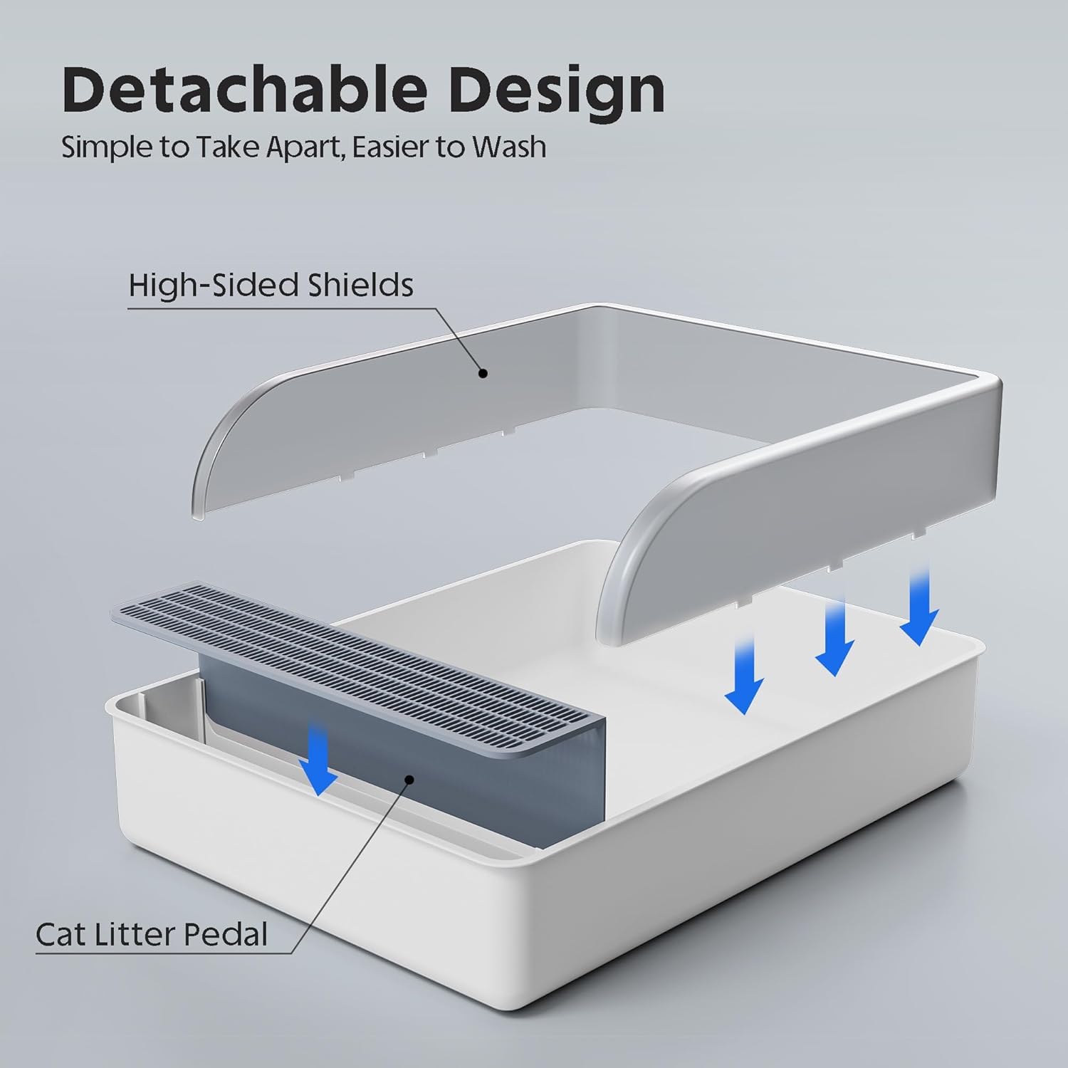 - 人間工学に基づいたデザイン:取り外し可能なバッフルは、実際の状況に応じて使用を調整しやすく、掃除も簡単です。中空のペダルは、ペットが砂を盆地から持ち出すのを防ぎます。
