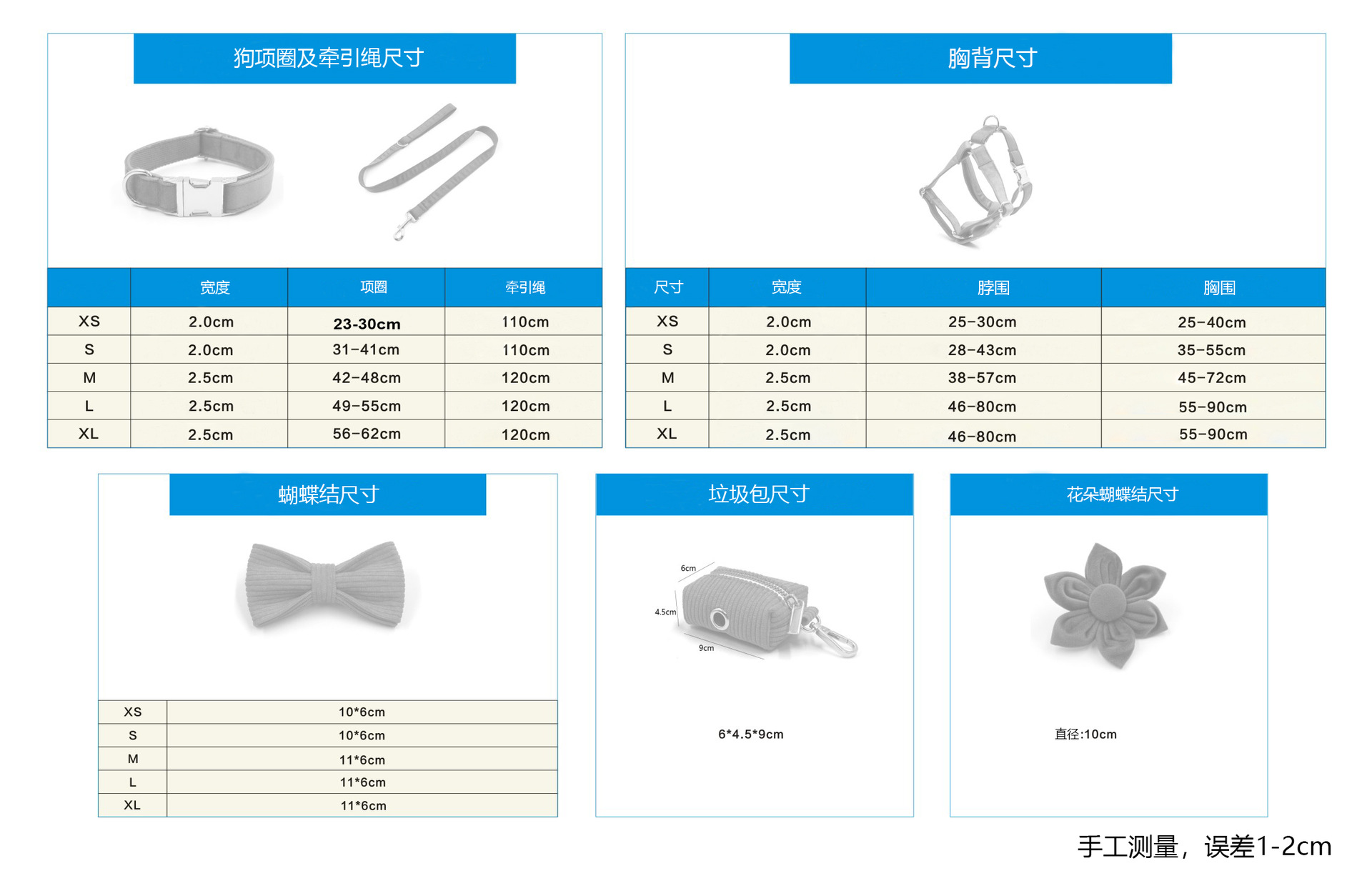 カラー:首輪、手持ちロープ、蝶ネクタイ、バババッグ、胸当て、花
